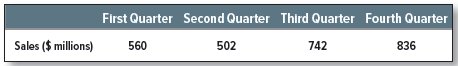 Suppose that 70% of Dynamic’s sales are paid for in the immediate quarter and the remaining 30% in the next. Table 29.5 shows forecast collections under this assumption. For example, you can see that in the first quarter, collections from current sales are 70% of $560, or $392 million. But the firm also collects 30% of the previous quarter’s sales, or .3 X $396.7 = $119.0 million. Therefore, total collections are $392 + $119.0 = $511.0 million.