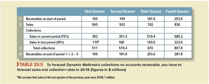 Dynamic started the first quarter with $150.0 million of accounts receivable. The quarter’s sales of $560 million were added to accounts receivable, but $511.0 million of collections were subtracted. Therefore, as Table 29.5 shows, Dynamic ended the quarter with accounts receivable of 150 + 560 – 511 = $199 million. The general formula is