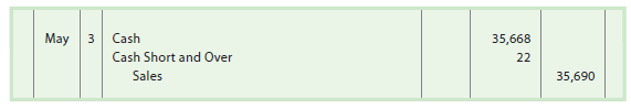 The cash sales, receipts, and shortage of $22 ($35,690 – $35,668) would be recorded as follows: