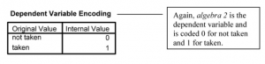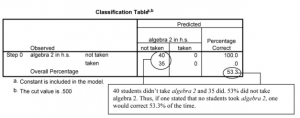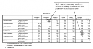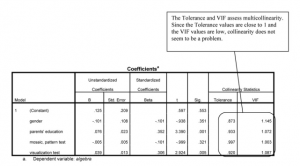 Is there a combination of gender, parents’ education, mosaic, and visualization test that predicts whether students will take algebra 2? Let’s try a logistic regression to predict a dichotomous (two category) dependent variable when the independent variables (called covariates in SPSS) are either dichotomous or normal/scale. First, we should check for multicollinearity. Because tolerance