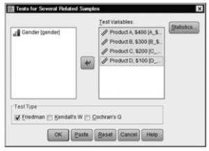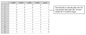 Open the SPSS for Windows program. Open the Product data set. Do not retrieve the hsbdataNew for this assignment. In this study, each of the 12 participants (or subjects) has evaluated four products that vary in cost (e.g., four brands of DVD players) on 1-7 Likert scales. Product A is the most expensive (i.e.,