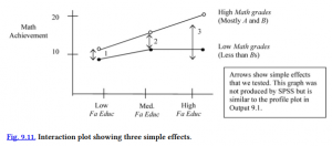 We have described, in the interpretation of Output 9.1, how to visually inspect and interpret the Profile Plots when there is a statistically significant interaction. In Problems 9.2b and 9.2c we will illustrate two ways to test the simple effects statistically. In the interpretation of Output 9.1, we indicated that you should examine the