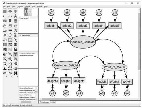 Let’s say I want to test a simple model that has three unobserved variables. The first vari- able is a concept called “Adaptive Behavior”, which explores customer’s perceptions that an employee adapted their behavior to the customer during an experience. This adaptation could be through verbal interaction or through their direct actions. The perceived Adap- tive Behavior construct is hypothesized to positively influence feelings of Customer Delight, which is going to influence intentions to spread positive word of mouth about the experience (Positive WOM).