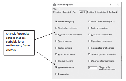 . This will start a pop-up window that will ask how much detail you want in the output of the analysis. Go to the “Output” tab at the top of the pop-up window, which will give all the pos-sible options. I prefer to select “Minimization History, Standardized Estimates, and Square Multiple Correlations”.You can also select “Modification Indices” and even change the thresh- old for how big a modification index needs to be in order to be visible. Other analysis options provide more information in the output, but I find that these options are all you really need for a simple CFA.