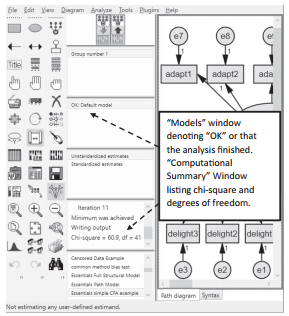 . Once the analysis is complete, you will see either an “OK” or “XX” in the “models” window. An “OK” means the model ran to completion; a “XX” means there is an error and the analysis did not finish. If an analysis is completed, you will also see the chi-square and degrees of freedom listed in the “Computational Summary” window.