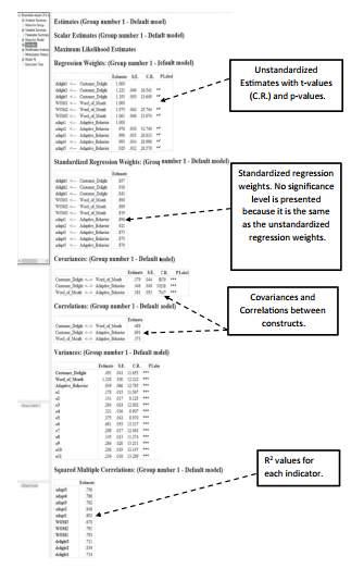 Along with modification indices,AMOS also provides a test of model misspecification through standardized residuals. The standardized residuals are the difference between the observed covariance matrix and the estimated covariance matrix for each pair of observed variables. You will specifically need to request for this information to be presented in the analysis of a SEM model. In the Analysis Properties Window, you will see a tab called “Output” and at the bottom of the window is a checkbox option for “Residual Moments”. You will need to select this box to see the Standardized Residuals in the analysis. After running the analysis, you will need to go into the output under the Estimates link and then select the Matrices option. AMOS will provide you with the unstandardized and standardized residuals, but only the standardized residuals need to be examined. Because the data is standardized, the unit of measurement is transformed to allow for easier comparison. If a residual value exceeds 2.58, then the residual of the observed and estimated covariance matrix is determined to be large (Joreskog and Sorbom 1988) and a sign of possible model misspecification. In the example output (see Figure 4.18), you can see that the biggest residual is 1.199, the difference of delight3 and adapt4.These indicators are across constructs, so no adjustment would be made in this instance. If the high residual value was within construct, then you would consider add- ing a covariance between the constructs’ error terms.