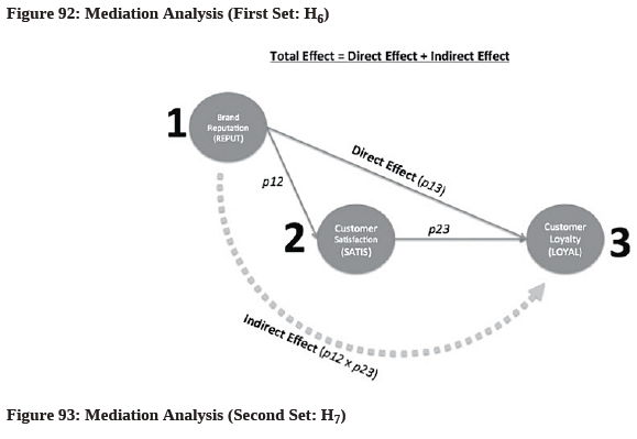 The relationships among constructs in PLS-SEM can be complex and not always straightforward. To gain a better understanding of the role of SATIS in our model, its potential mediating effect on the linkage between REPUT and LOYAL (see Figure 92), and those between PRICE and LOYAL (see Figure 93) are examined in Susan’s research. This is accomplished by following the Preacher and Hayes (2008) procedure97, which involves the use of bootstrapping in a 2-step procedure: (i) the significance of direct effect is first checked98 using bootstrapping without the presence of the mediator SATIS in the model99, and (ii) the significance of indirect effect”9 and associated T-Values— are then checked using the path coefficients when the mediator SATIS is included in the model192. This 2-step procedure is performed twice; first for testing the hypothesis six (H6) and then subsequently for hypothesis seven (H7). (see Figure 94 and 95)