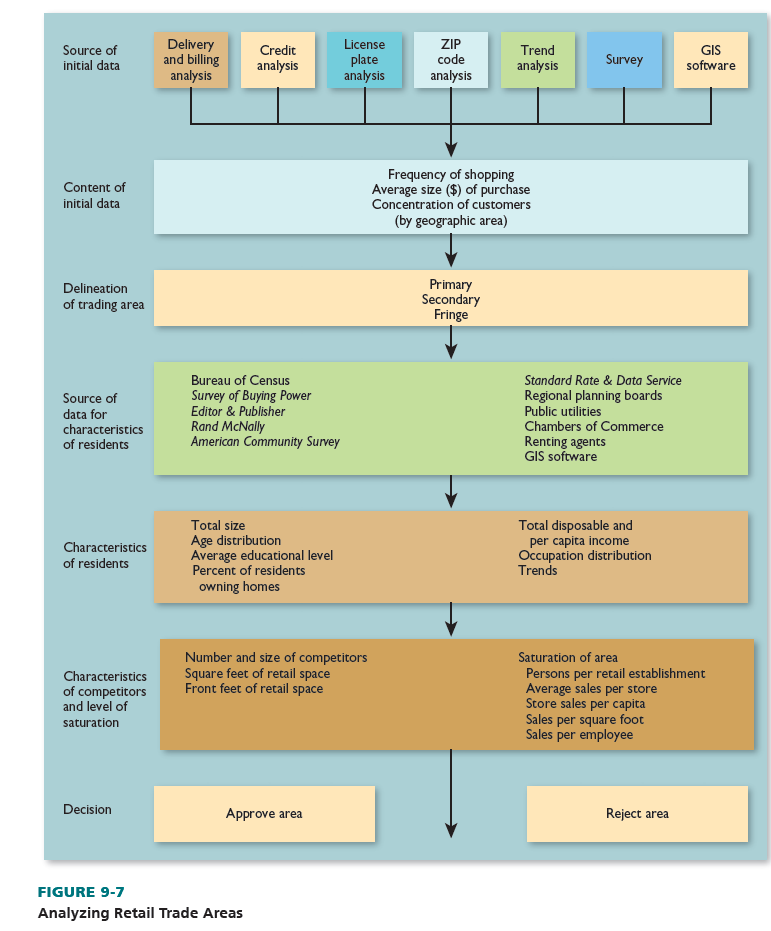 After the size and shape of alternative trading areas are determined, the characteristics of those areas are studied. Of special interest are the attributes of residents and how well they match the firm’s definition of its target market. An auto repair franchisee may compare opportunities in several locales by reviewing the number of car registrations; a hearing aid retailer may evaluate the percentage of the population 60 years of age or older; and a bookstore retailer may be concerned with residents’ education level.