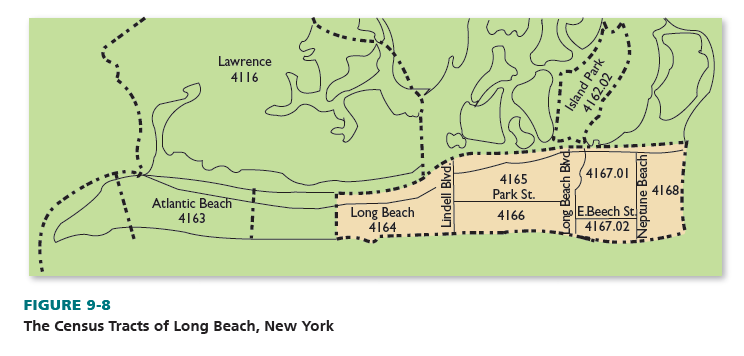 The value of the Census of Population’s actual 2010 census tract data can be shown by an illustration of Long Beach, New York, which is 30 miles east of New York City on Long Island’s south shore. Long Beach includes the six census tracts highlighted in Figure 9-8: 4164, 4165, 4166, 4167.01, 4167.02, and 4168. Although tract 4163 is contiguous with Long Beach, it represents another community. Table 9-2 shows various population statistics for each Long Beach census tract. Overall, Long Beach is above average in most demographics. However, resident attributes in each tract do differ; thus, a retailer may locate in one or more tracts but not in others.