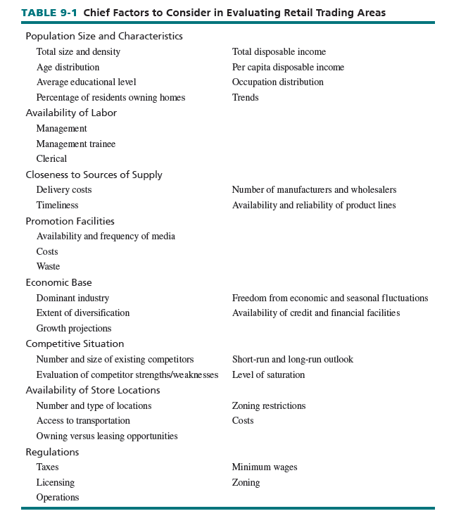 Among the trading-area factors that should be studied by most retailers are the population size and characteristics, availability of labor, closeness to sources of supply, promotion facilities, economic base, competition, availability of locations, and regulations. The economic base is an area’s industrial and commercial structure—the companies and industries that residents depend on to earn a living. The dominant industry (company) in an area is important because its drastic decline may have adverse effects on a large segment of residents. An area with a diverse economic base, where residents work for a variety of nonrelated industries, is more secure than an area with one major industry. Table 9-1 summarizes a number of factors to consider in evaluating retail trading areas.