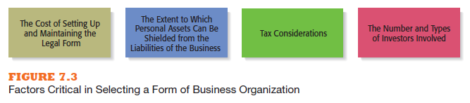 There is no single form of business organization that works best in all situations. It’s up to the owners of a firm and their attorney to select the legal entity that best meets their needs. The decision typically hinges on several fac- tors, which are shown in Figure 7.3. It is important to be careful in selecting a legal entity for a new firm because each form of business organization involves trade-offs among these factors and because an entrepreneur wants to be sure to achieve the founders’ specific objectives.