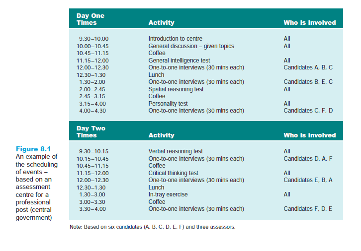 Assessment centres incorporate multiple selection techniques, and group selection methods outlined above form a major element, together with other work-simulation exercises such as in-basket tasks, psychological tests, a variety of interviews and presentations. Assessment centres are used to assess, in depth, a group of broadly similar applicants, using a set of competencies required for the post on offer and a series of behavioural statements which indicate how these competencies are played out in practice. Even assuming that the competencies for the job in question have already been identified, assessment centres require a lengthy design process to select the appropriate activities so that every competency will be measured via more than one task. Assessment centres have been proven to be one of the most effective ways of selecting candidates – this is probably due, as Suff (2005b) notes, to the use of multiple measures, multiple assessors and predetermined assessment criteria.