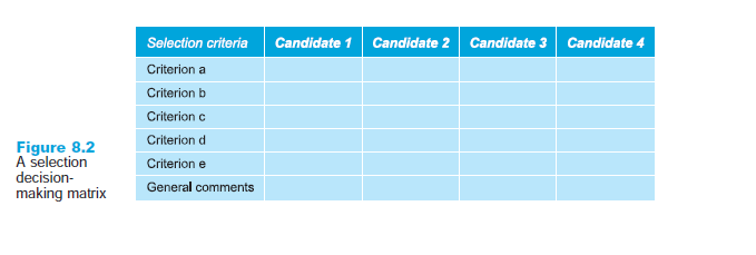The selection decision involves measuring the candidates individually against the selection criteria defined in the person specification, and not against each other. A useful tool to achieve this is the matrix in Figure 8.2. This is a good method of ensuring that every candidate is assessed against each selection criterion and in each box in the matrix the key details can be completed. The box can be used whether a single selection method was used or multiple methods. If multiple methods were used and contradictory information is found against any criterion, this can be noted in the decision-making process.