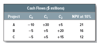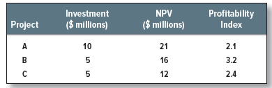 All three projects are attractive, but suppose that the firm is limited to spending $10 million. In that case, it can invest either in project A or in projects B and C, but it cannot invest in all three. Although individually B and C have lower net present values than project A, when taken together they have the higher net present value. Here we cannot choose between projects solely on the basis of net present values. When money is limited, we need to concentrate on getting the biggest bang for our buck. In other words, we must pick the projects that offer the highest net present value per dollar of initial outlay. This ratio is known as the profitability index:10