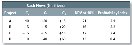 One strategy is to accept projects B and C; however, if we do this, we cannot also accept D, which costs more than our budget limit for period 1. An alternative is to accept project A in period 0. Although this has a lower net present value than the combination of B and C, it provides a $30 million positive cash flow in period 1. When this is added to the $10 million budget, we can also afford to undertake D next year. A and D have lower profitability indexes than B and C, but they have a higher total net present value.