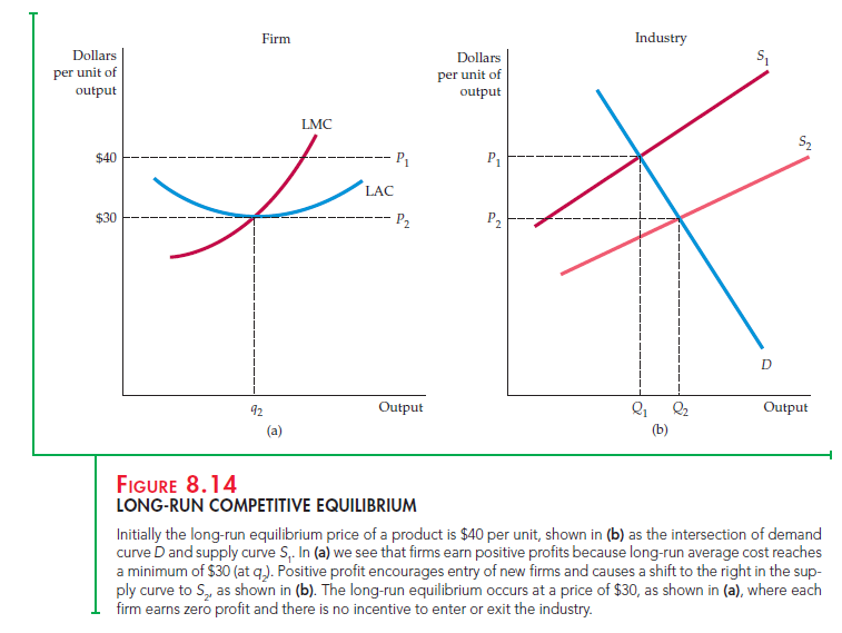 FIRMS HAVING IDENTICAL COSTS To see why all the conditions for long-run equilibrium must hold, assume that all firms have identical costs. Now consider what happens if too many firms enter the industry in response to an opportu- nity for profit. The industry supply curve in Figure 8.14(b) will shift further to the right, and price will fall below $30—say, to $25. At that price, however, firms will lose money. As a result, some firms will exit the industry. Firms will con- tinue to exit until the market supply curve shifts back to S2. Only when there is no incentive to exit or enter can a market be in long-run equilibrium.
