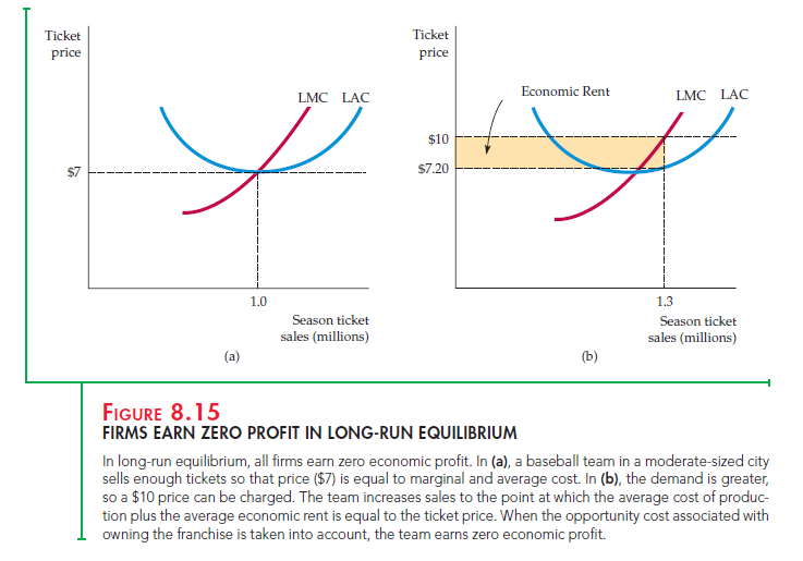 Figure 8.15 shows that firms earning economic rent earn the same economic profit as firms that do not earn rent. Part (a) shows the economic profit of a base- ball team located in a moderate-sized city. The average price of a ticket is $7, and costs are such that the team earns zero economic profit. Part (b) shows the profit of a team that has the same cost curves even though it is located in a larger city.