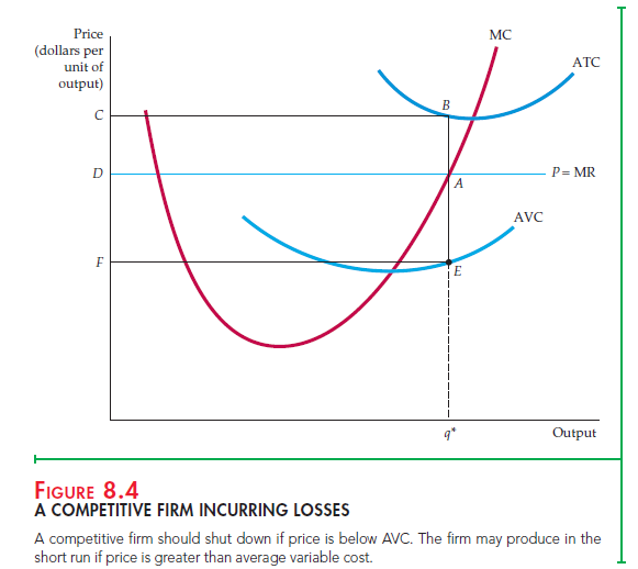 Note that the firm is losing money when its price is less than average total cost at the profit-maximizing output q*. In that case, if there is little chance that conditions will improve, it should shut down and leave the industry. This deci- sion is appropriate even if price is greater than average variable cost, as shown in Figure 8.4. If the firm continues to produce, the firm minimizes its losses at output q*, but it will still have losses rather than profits because price is less than average total cost. Note also that in Figure 8.4, because of the presence of fixed costs, average total cost exceeds average variable cost, and average total cost also exceeds price, so that the firm is indeed losing money. Recall that fixed costs do not change with the level of output, but they can be eliminated if the firm shuts down. (Examples of fixed costs include the salaries of plant managers and security personnel, and the electricity to keep the lights and heat running.)