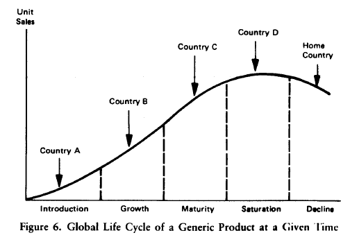 Firms in the United States and a small number of other advanced countries introduce most of the new consumer and industrial products. Generally, new products are first commercialized in the home market and then spread to other country markets at varying speeds. At any one time, therefore, a product occupies different phases of the global life cycle in different countries. It is at the most advanced phase in the home country and the next most advanced phase in other industrial countries, while it is at earlier phases in developing countries. Indeed, it may not have been introduced at all in the least developed countries. At some time in the future, the global life cycle will run its course as the generic product in question experiences saturation and decline in all country markets.