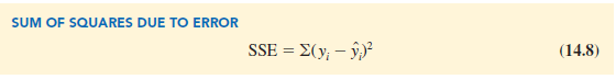 Equation (14.11) shows that the total sum of squares can be partitioned into two components, the sum of squares due to regression and the sum of squares due to error. Hence, if the values of any two of these sum of squares are known, the third sum of squares can be computed easily. For instance, in the Armand’s Pizza Parlors example, we already know that SSE = 1530 and SST = 15,730; therefore, solving for SSR in equation (14.11), we find that the sum of squares due to regression is