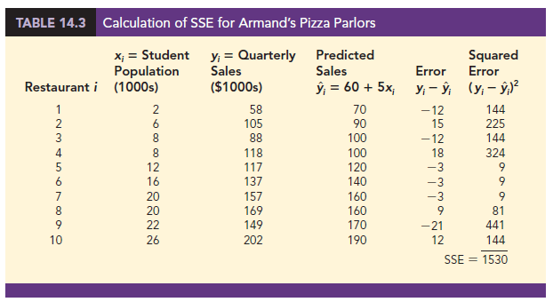 In Table 14.3 we show the calculations required to compute the sum of squares due to error for the Armand’s Pizza Parlors example. For instance, for restaurant 1 the values of the independent and dependent variables are x1 = 2 and y1 = 58. Using the estimated regression equation, we find that the predicted value of quarterly sales for restaurant 1 is y1 = 60 + 5(2) = 70. Thus, the error in using y1 to predict y1 for restaurant 1 is y1 – y1 = 58 – 70 = -12. The squared error, (—12)2 = 144, is shown in the last column of Table 14.3. After computing and squaring the residuals for each restaurant in the sample, we sum them to obtain SSE = 1530. Thus, SSE = 1530 measures the error in using the estimated regression equation y = 60 + 5x to predict sales.