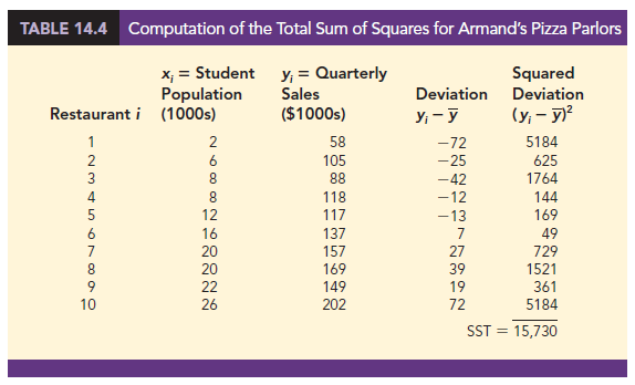 Table 14.2 showed that for the sales data, oyi = 1300. Hence, the mean value of quarterly sales for the sample of 10 Armand’s restaurants is y = oyi/n = 1300/10 = 130. In Table 14.4 we show the sum of squared deviations obtained by using the sample mean y = 130 to predict the value of quarterly sales for each restaurant in the sample. For the ith restaurant in the sample, the difference yi − y provides a measure of the error involved in using y to predict sales. The corresponding sum of squares, called the total sum of squares, is denoted SST.