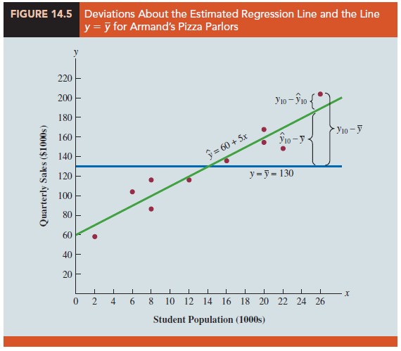 For the Armand’s Pizza Parlors example, we developed the estimated regression equation y = 60 + 5x to approximate the linear relationship between the size of the student population x and quarterly sales y. A question now is: How well does the estimated regression equation fit the data? In this section, we show that the coefficient of determination provides a measure of the goodness of fit for the estimated regression equation.