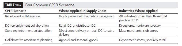 VICS has identified the four scenarios in Table 10-2 as the most common areas in which large-scale CPFR deployments have taken place between a retailer and a manufacturer. Next, we describe each of the four scenarios.