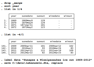 File lakesun.dta contains ice out dates for New Hampshire’s second-largest lake over the years 1869 through 2012. Although the Lake Sunapee (lakesun.dta) and Lake Winnipesaukee (lakewin3.dta) records come from different sources, both form yearly series that could easily be combined into one dataset. We do this with the merge 1:1 year command.