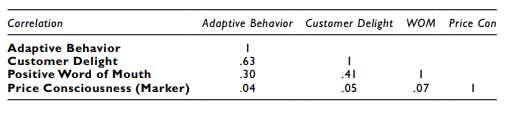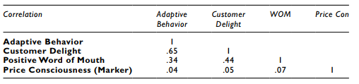 Let’s initially examine the correlation of Adaptive Behavior and Customer Delight. The unadjusted correlation is .65.The second lowest correlation of Price Consciousness (marker) to any other construct in the model is .05. Next, let’s get the adjusted correlation for Adaptive Behavior and Customer Delight.