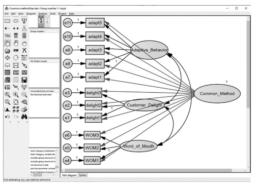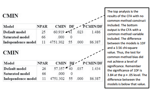 You do not need to covary your constructs in the model with the common_method construct. Just hit the “Proceed with the Analysis” button to continue without adding additional covari- ances.After the analysis finishes, go into the output and go to the model fit link.With the com- mon method test, we will perform a chi-square difference test to determine if bias is present. Specifically, you are concerned with the chi-square values of the CFA model. The CFA com- parison will examine what the chi-square value was for your CFA when the common method construct was not included, and then a comparison will be made to the chi-square value of the CFA when the common method construct was included. In the analysis, you should see only 1 degree of freedom difference between the two models. Remember, we constrained all the relationships in the common method construct model to be equal. Hence, we need to see if the difference in chi-square is significant which would indicate a common method bias.
