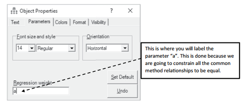 After drawing a path from the common method construct to all the indicators, you will need to constrain all the relationships from the common method factor to be equal. We are doing this to see what is the common influence across all the indicators. If common method bias is present, it should affect all the variables of the survey equally. Right click on one of the relationships (arrows) from the common method construct; the Object Properties window should appear. Under the Parameters tab at the top, put a letter in the “regression weight” line. In this example, I labeled the regression weight simply “a”, but you could call it anything you want. After labeling the parameter, you can cancel out of this screen.
