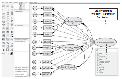 so that you are not having any unintended action with the high- lighted relationships from the com- mon method factor. After constraining all the relationships to be equal, you next need to right click in the unob- servable common method variable. The Object Properties window will appear. You should set the variance of the unobserved construct to “1”. This is done because we are concerned only about the impact of the potential bias to the indicators of our model.