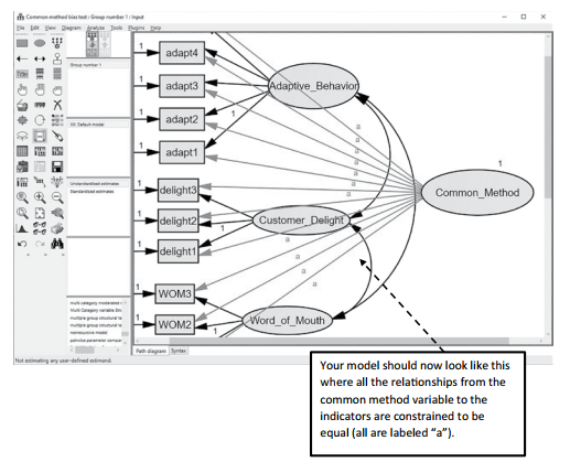 You can go into each relationship and constrain all the parameters to the letter “a”, but this might be extremely time consuming if you have a large number of indicators. AMOS has a function that lets you copy a constraint to other relationships. So, we will copy this constraint of letter “a” and paste it in all other relationships from the common method construct. To do this, the first thing you need to do is select all the other relationships from the common method variable (do not select the one that is already constrained with an “a”). The easiest way to do this is to use the