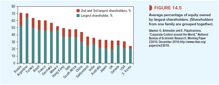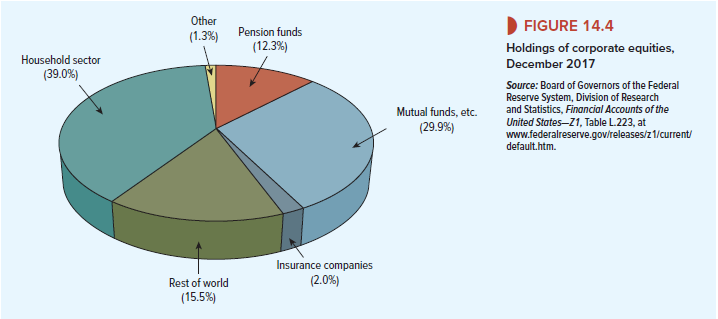 A corporation is owned by its common stockholders. You can see from Figure 14.4 that in the United States, 39% of this common stock is held directly by individual investors, and a similar proportion belongs to financial intermediaries such as mutual funds, pension funds, and insurance companies. Mutual funds and exchange traded funds (ETFs) hold 30% and pension funds a further 12%.4
