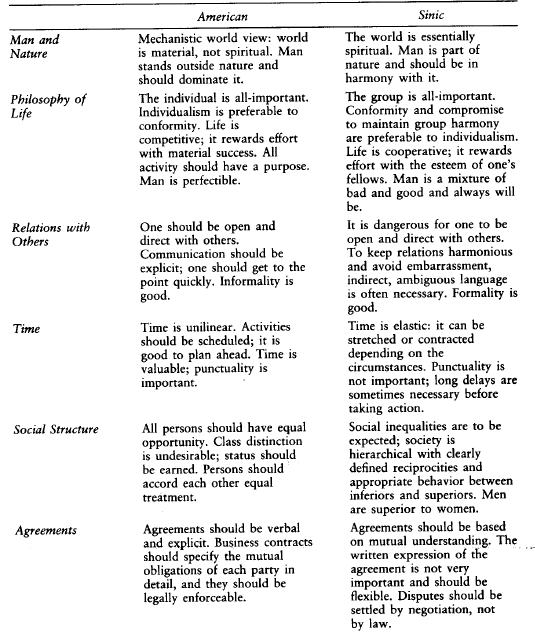 High-context messages can be understood only by someone who has been “programmed” with the necessary information (internal context) and an understanding of the setting (external context). The Japanese and Chinese, therefore, must know much more that is going on at the covert level. It is the ignorance of Americans and other Westerners of the hidden, contextual perceptions that so confounds communication with the Chinese and Japanese or with persons in other high-context cultures. That is why Hall says it is “sheer folly” to get seriously involved with high-context cultures unless one is really “contexted.”10