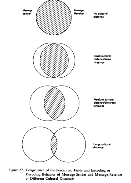 Figure 27 depicts the congruence between the perceptual fields and encoding/decoding behavior of a message sender and a message receiver at different cultural distances. The greater the congruence, as shown by the cross-hatched overlaps, the lower the probability of cultural distortions in communication. When sender and receiver belong to the same culture, the congruence is complete, which is to say there is no cultural distance.” Although incomplete, congruence is substantial when the sender and receiver are separated by a small cultural distance but use the same language.