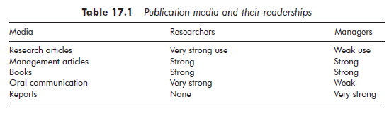 Research can be communicated through five general types of publications: research articles, managerial articles, books, conference papers and reports. To these can be added, although generally only once in the life of a researcher, a doctoral dissertation. There is an amount of consistency between the two principal readerships – researchers and managers – and the different publication media, as is shown in Table 17.1.