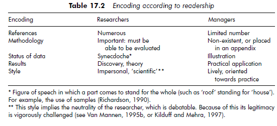 Communication of research work can be directed towards various readers. Research on organizations may be of interest to three particular kinds of readers: researchers, managers and other members of the organization, and, to a lesser extent, the general public. The same research project may then need to be adapted to different target audiences – and for this the text will need to be encoded. This encoding is the subject of the first part of this section, while the second part identifies the requirements of different audiences. The third and final part will examine the particular case of communication media destined for a readership made up of other researchers.