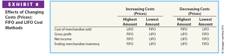 The preceding differences show the effect of increasing costs (prices). If costs (prices) remain the same, all three methods would yield the same results. However, costs (prices) normally do change. The effects of changing costs (prices) on the FIFO and LIFO methods are summarized in Exhibit 8. The weighted average cost method will always yield results between those of FIFO and LIFO.