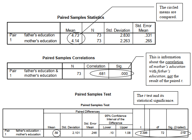 The first table shows the descriptive statistics used to compare mother’s and father’s education levels. The second table, Paired Samples Correlations, provides correlations between the two paired scores. The correlation (r = .68) between mother’s and father’s education indicates that highly educated men tend to marry highly educated women and vice versa. It doesn’t tell you whether men or women have more education. That is what t in the third table tells you.