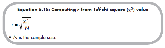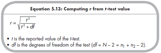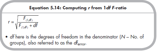 As when computing r from significance tests (t or F), it is important to take either the positive or negative square root from Equation 5.16 to represent the direction of the effect.