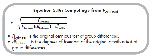 You then follow the same steps described in the previous section: (1) computing Fcontrast as MScontrast/MSwithin; (2) computing r using Equation 5.18. Thus, obtaining r from data where there are three or more groups is