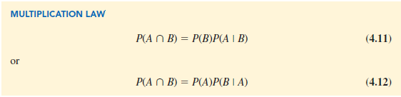 Whereas the addition law of probability is used to compute the probability of a union of two events, the multiplication law is used to compute the probability of the intersection of two events. The multiplication law is based on the definition of conditional probability. Using equations (4.7) and (4.8) and solving for P(A fl B), we obtain the multiplication law.