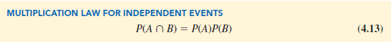 Before concluding this section, let us consider the special case of the multiplication law when the events involved are independent. Recall that events A and B are independent whenever P(A I B) = P(A) or P(B I A) = P(B). Hence, using equations (4.11) and (4.12) for the special case of independent events, we obtain the following multiplication law.