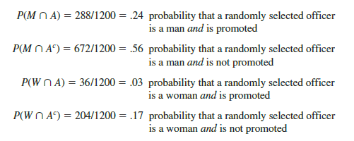 As an illustration of the application of conditional probability, consider the situation of the promotion status of male and female officers of a major metropolitan police force in the eastern United States. The police force consists of 1200 officers, 960 men and 240 women. Over the past two years, 324 officers on the police force received promotions. The specific breakdown of promotions for male and female officers is shown in Table 4.4.