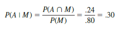 We now see that the conditional probability P(A I M) can be computed as .24/.80. Refer to the joint probability table (Table 4.5). Note in particular that .24 is the joint probability of A and M; that is, P(A n M) = .24. Also note that .80 is the marginal probability that a randomly selected officer is a man; that is, P(M) = .80. Thus, the conditional probability P(A I M) can be computed as the ratio of the joint probability P(A n M) to the marginal probability P(M).