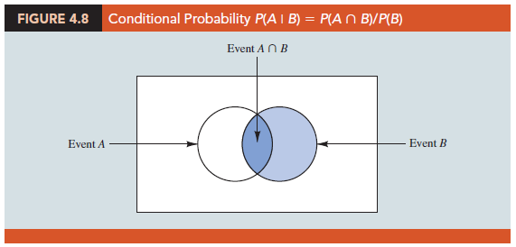 The Venn diagram in Figure 4.8 is helpful in obtaining an intuitive understanding of conditional probability. The circle on the right shows that event B has occurred; the portion of the circle that overlaps with event A denotes the event (A n B). We know that once event B has occurred, the only way that we can also observe event A is for the event (A n B) to occur. Thus, the ratio P(A n B)/P(B) provides the conditional probability that we will observe event A given that event B has already occurred.