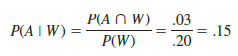 We already determined that P(A I M) = .30. Let us now use the probability values in Table 4.5 and the basic relationship of conditional probability in equation (4.7) to compute the probability that an officer is promoted given that the officer is a woman; that is, P(A I W). Using equation (4.7), with W replacing B, we obtain