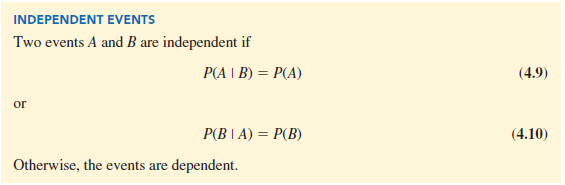 To summarize this section, we note that our interest in conditional probability is motivated by the fact that events are often related. In such cases, we say the events are dependent and the conditional probability formulas in equations (4.7) and (4.8) must be used to compute the event probabilities. If two events are not related, they are independent; in this case neither event’s probability is affected by whether the other event occurred.